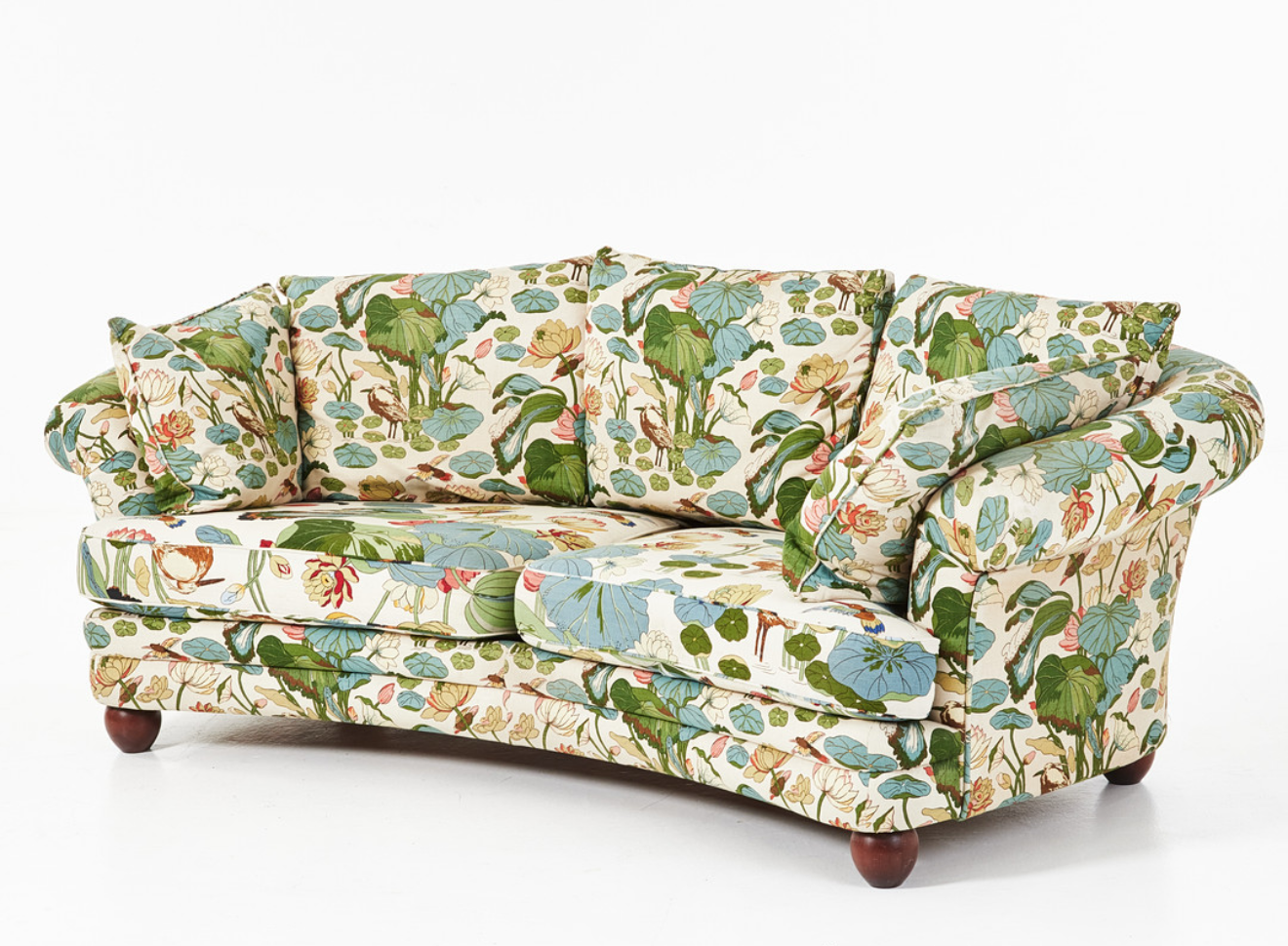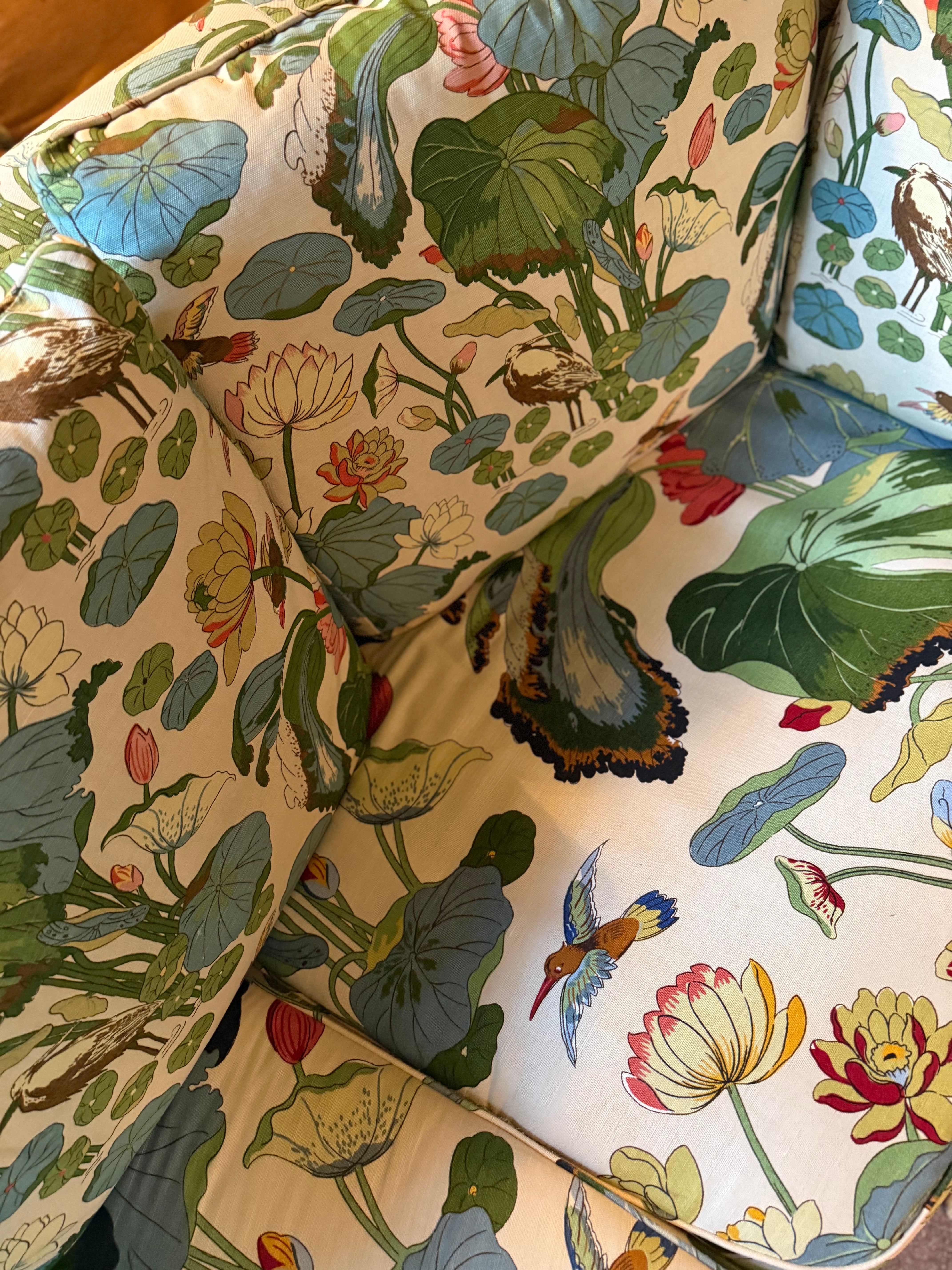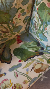 Sofaen er trukket om i det ikoniske stoffet Nympheus produsert i samarbeid med Svenskt tenn og ble kun solgt via butikken på Strandvägen i sin tid.