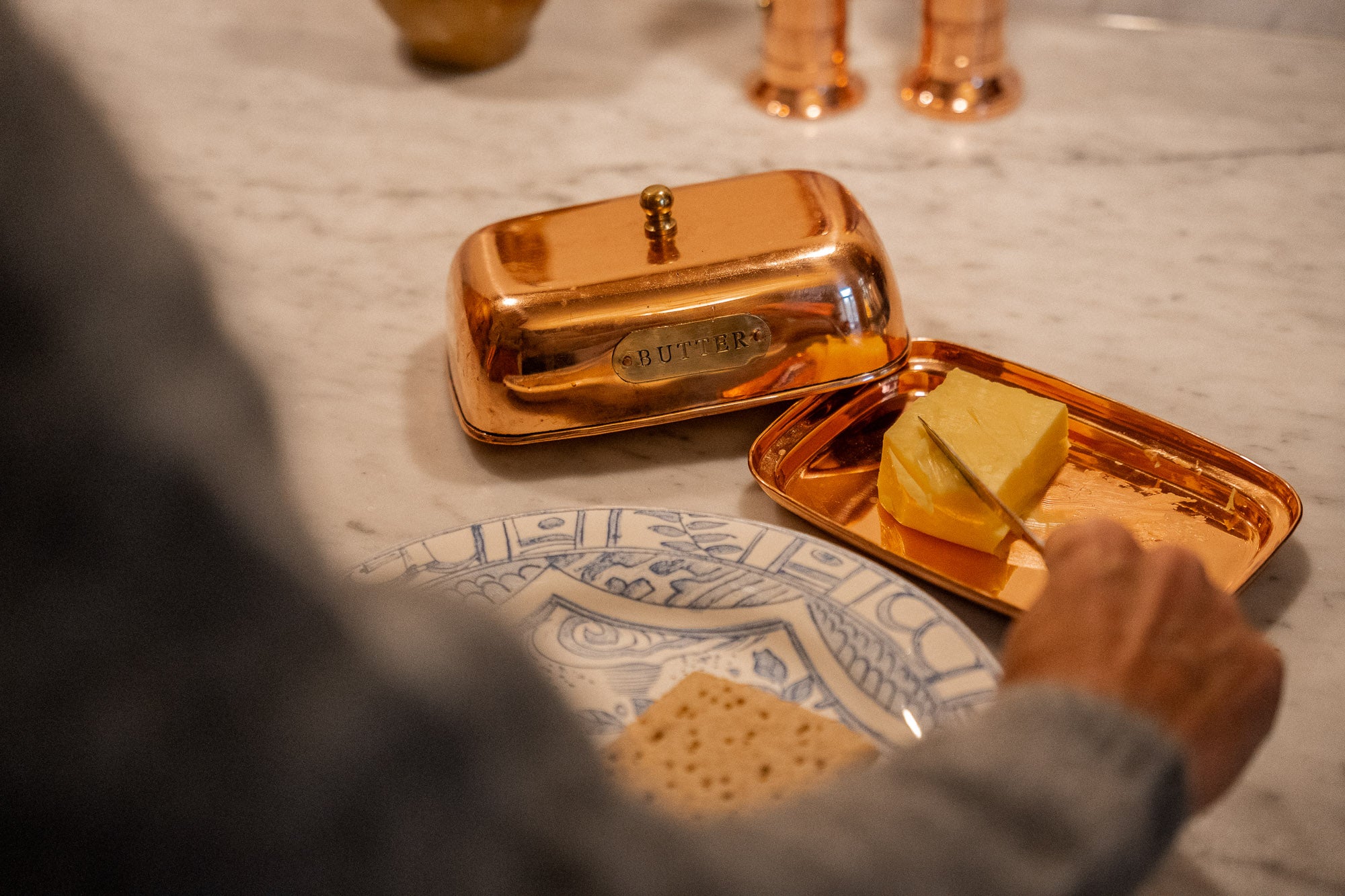 Tidløs og elegant smørklokke i kobber med messing detaljer