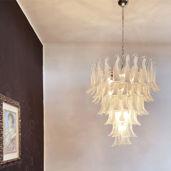 Huge Italian Murano chandelier made by 75 glass petals (transparent and white “lattimo”) in a chrome frame. Dimensions: 65 inches (165 cm) height with chain. 37,40 inches (95 cm) height without chain. 31,50 inches (80 cm) diameter. 13 E14 Light Bulbs (Not included).