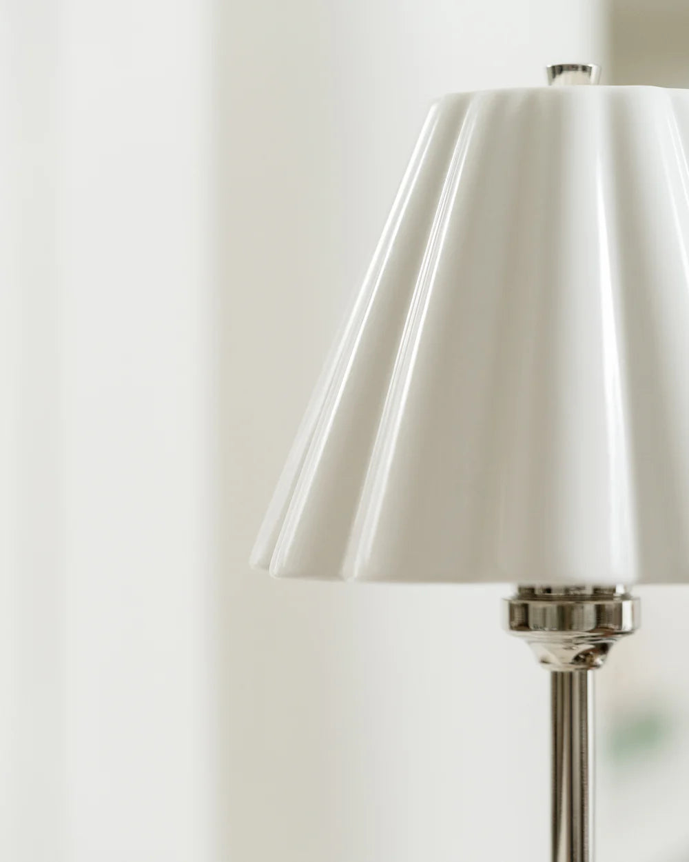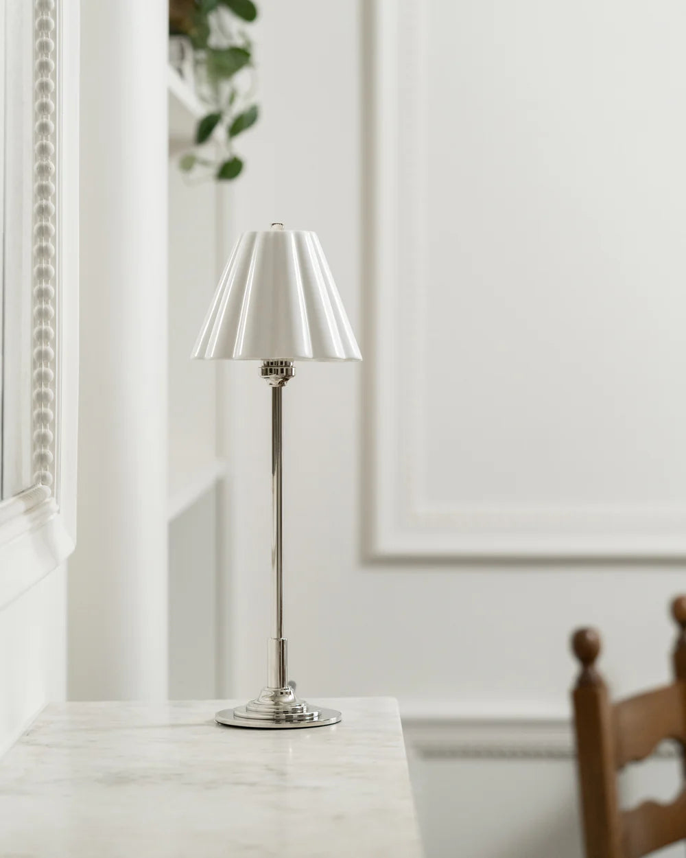 Vakker bordlampe laget av Nikkel, kombinert sammen med en elegant porselensskjerm som gir varm & stemningsfull belysning til hjemmet ditt.