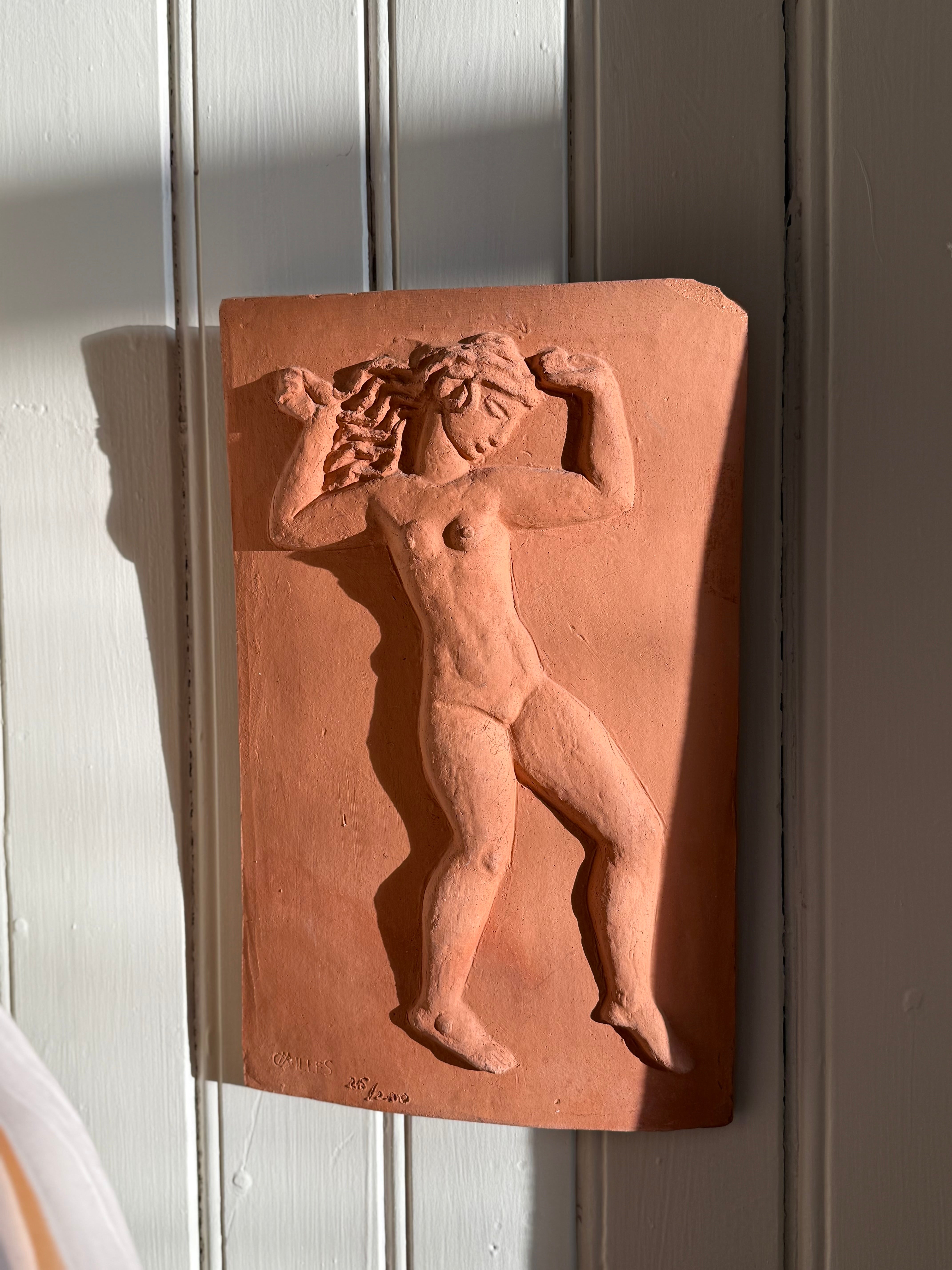 Relieff i terrakotta signert av Carl Milles. Skulpturen viser en idealisert menneskefigur i en dynamisk positur, utført i Milles klassisk-inspirerte formspråk.