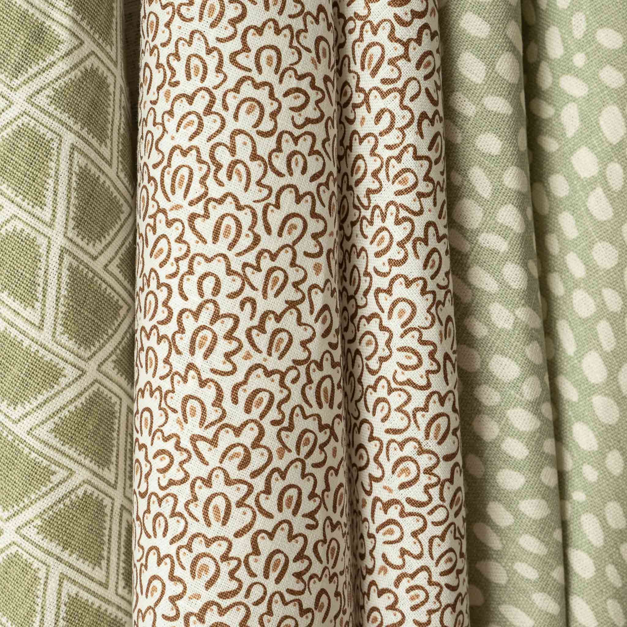 Bruk: Siden dette er et lettere stoff, egner det seg best til lettere bruk, som gardiner, dekorative puter og sengegavler. Vær oppmerksom på at overeksponering for sollys kan få stoffet til å falme litt over tid.