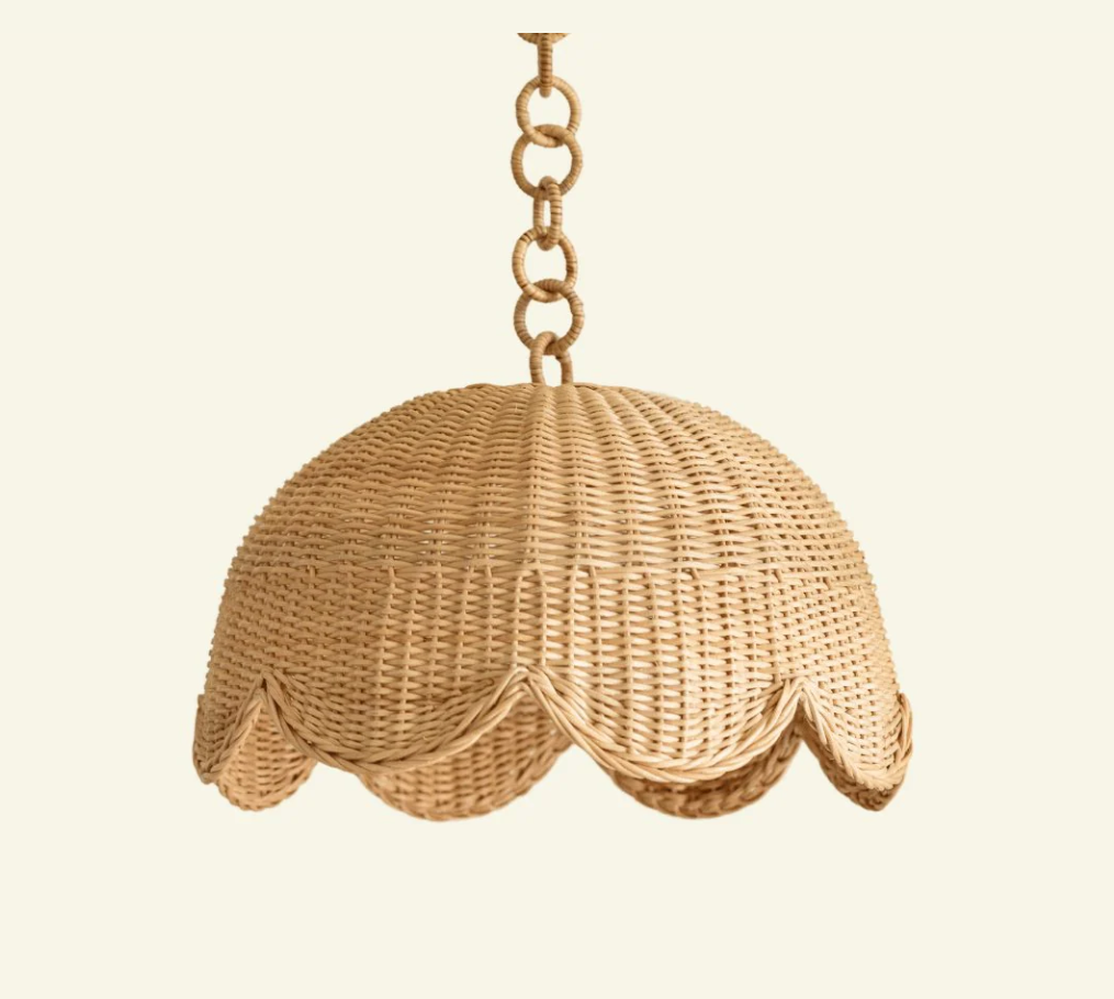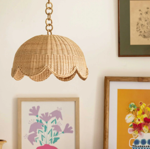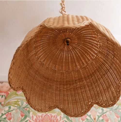 Lampeskjerm har et dekorativt rottingkjede festet som henger fra taket. Det er ingen armatur inne i lampeskjermen, noe som betyr at den kan fungere med alle lysarmaturer.