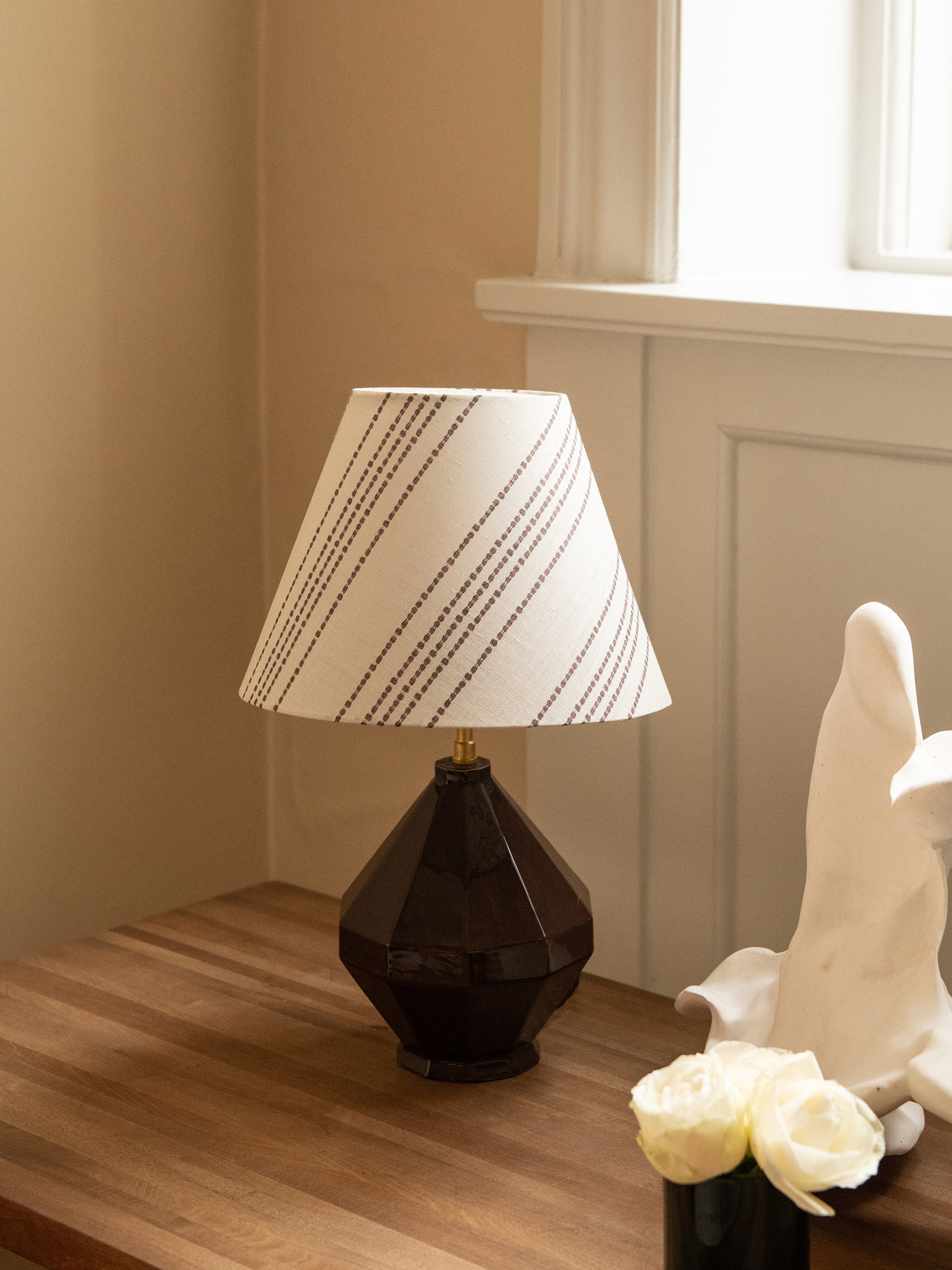 Lampeskjermen er nøye laget i stoff fra Helene Blanche sin kolleksjon av tekstiler.