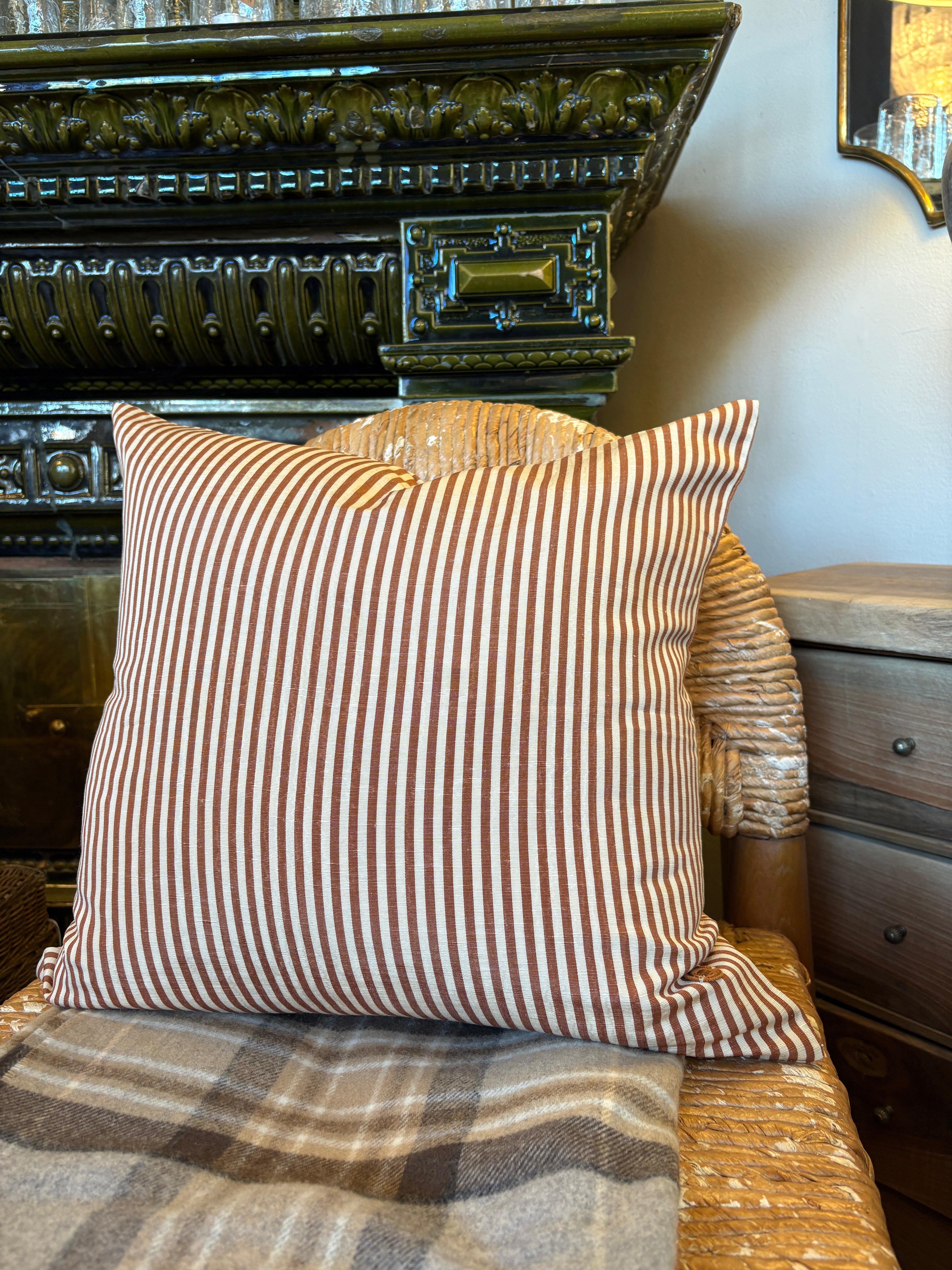 Nydelig skreddersydd pute av Helene Blanche sitt tekstil moire i fargen Amber.
