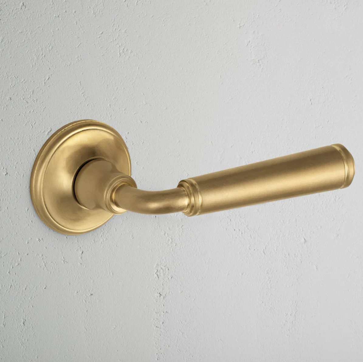 Enkelt og tradisjonelt dørhåndtak i fargen antikk messing.