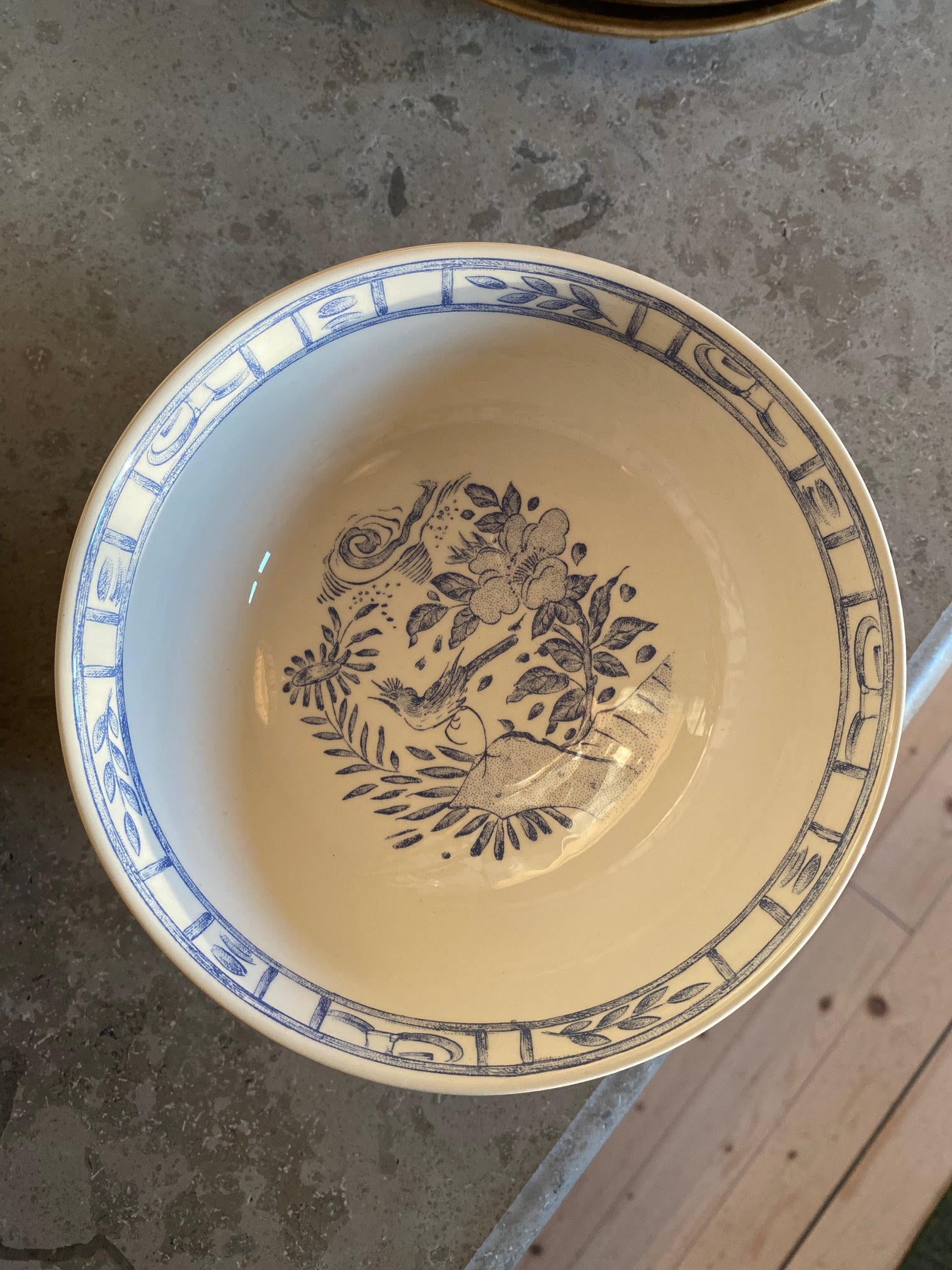 A blue bird evolves against a background of branches and geometric patterns. In the color version of Blue Bird, bright fruits are added to the subtle blue background, providing a joyful splash of color. This classic design has become a must-have over the decades.