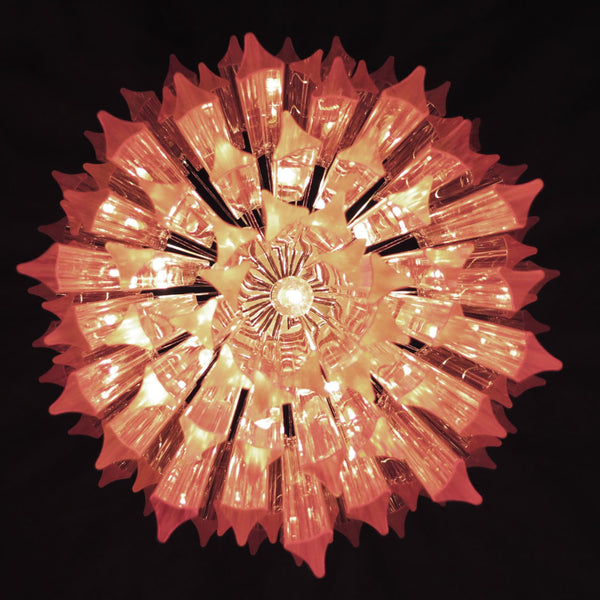 Fantastic Murano chandelier made by 107 Murano crystal pink prism in a nickel metal frame. Dimensions: 55.10 inches height (140 cm) with chain. 29.50 inches height (75 cm) without chain. 18.90 inches diameter (48 cm). 5 E27 Light bulbs and 1 E14 Light bulb (Not included).