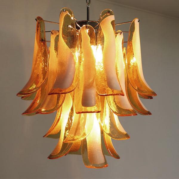 Italian Murano chandelier made by 26 glass petals (amber and white "lattimo") in a chrome frame. Dimensions: 47.250 inches (120 cm) height with chain. 23.62 inches (60 cm) height without chain. 19.70 inches (50 cm) diameter. 4 E27 Light bulbs (Not included)