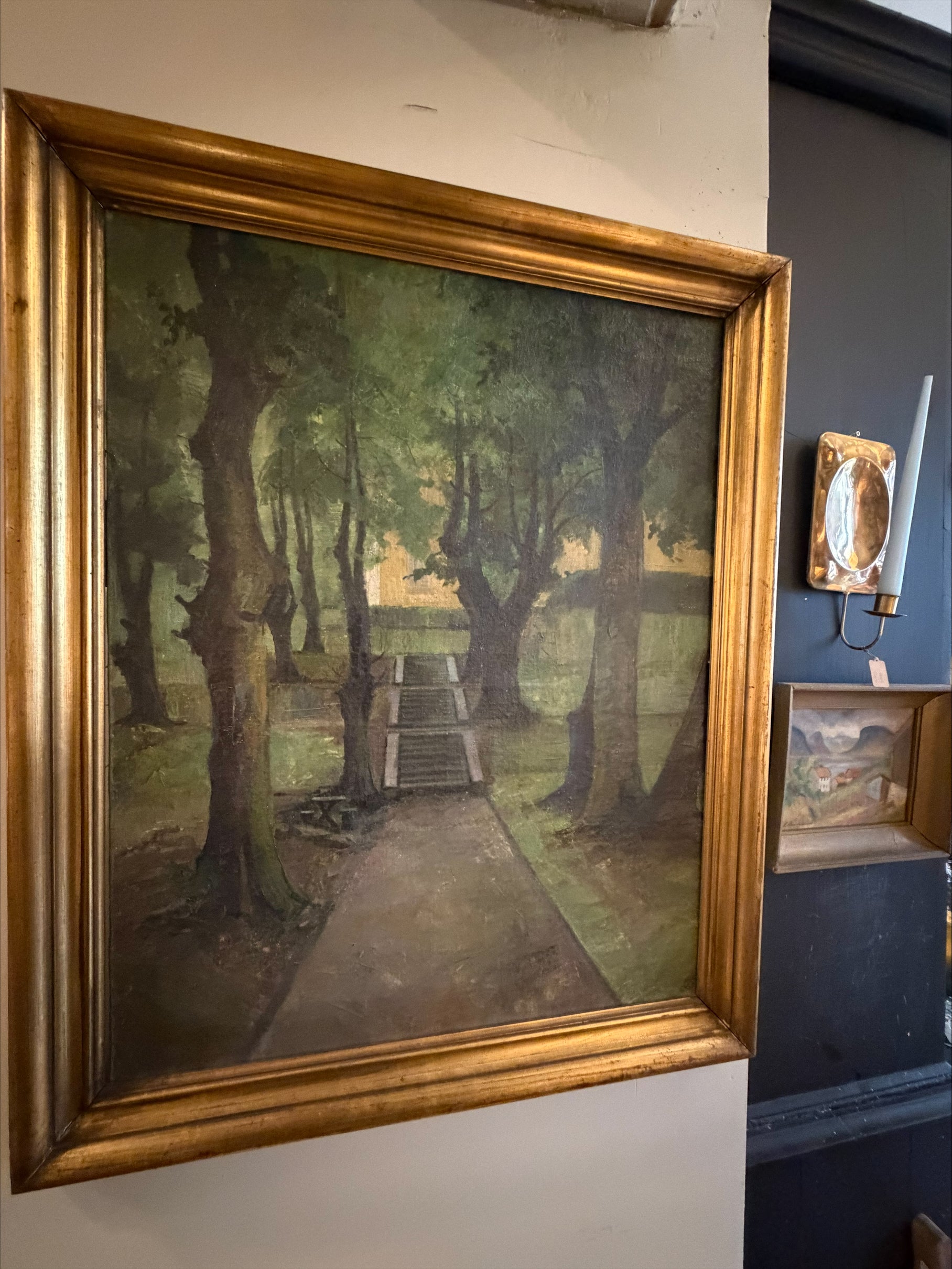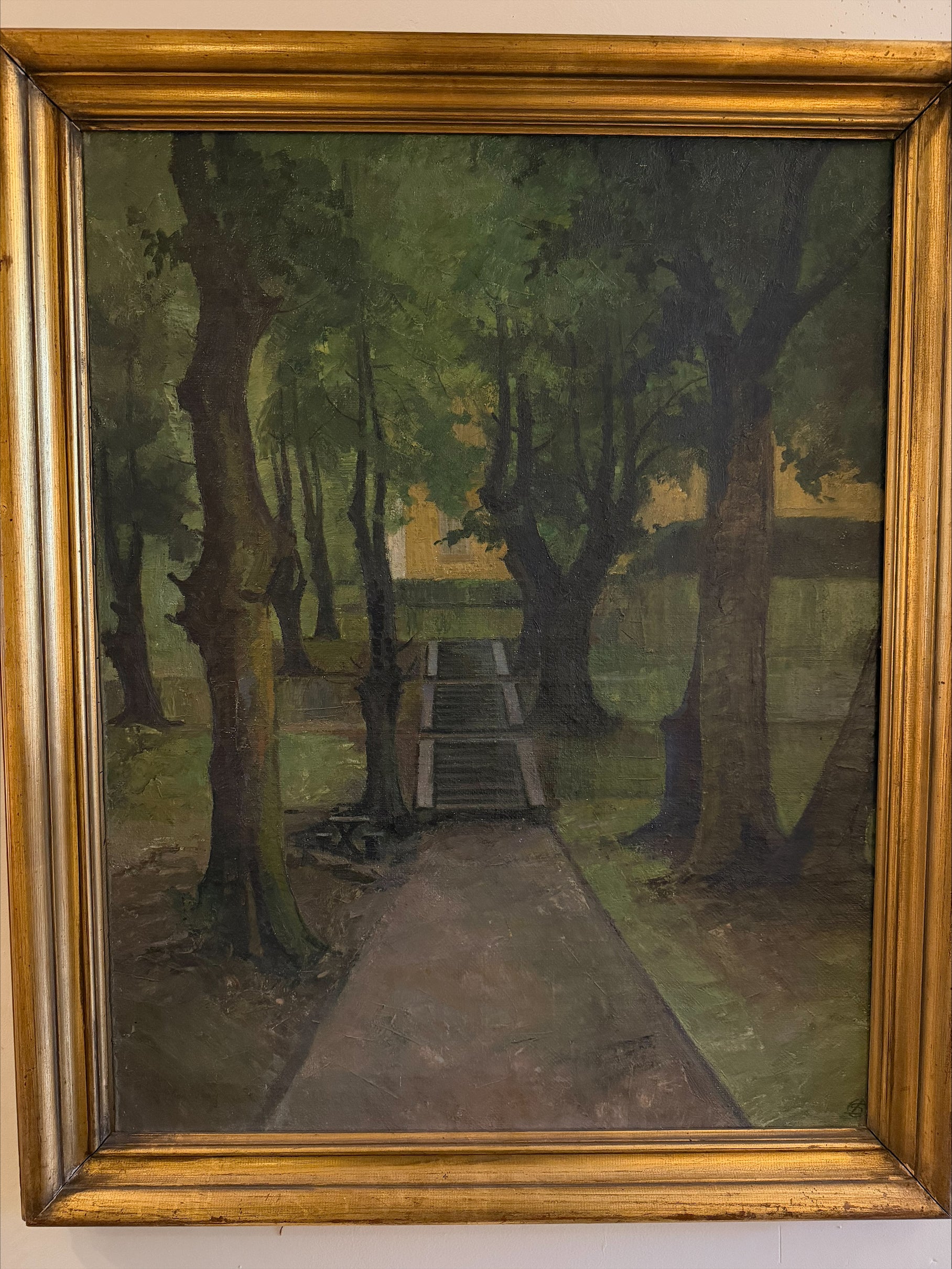 Nydelig vintage maleri av Jens Sinding Christensen (1888-1989), med motiv fra haven ved Fredriksberg slott. olje på lerret. H. 75 x 60 cm, med ramme 90 x 73 cm