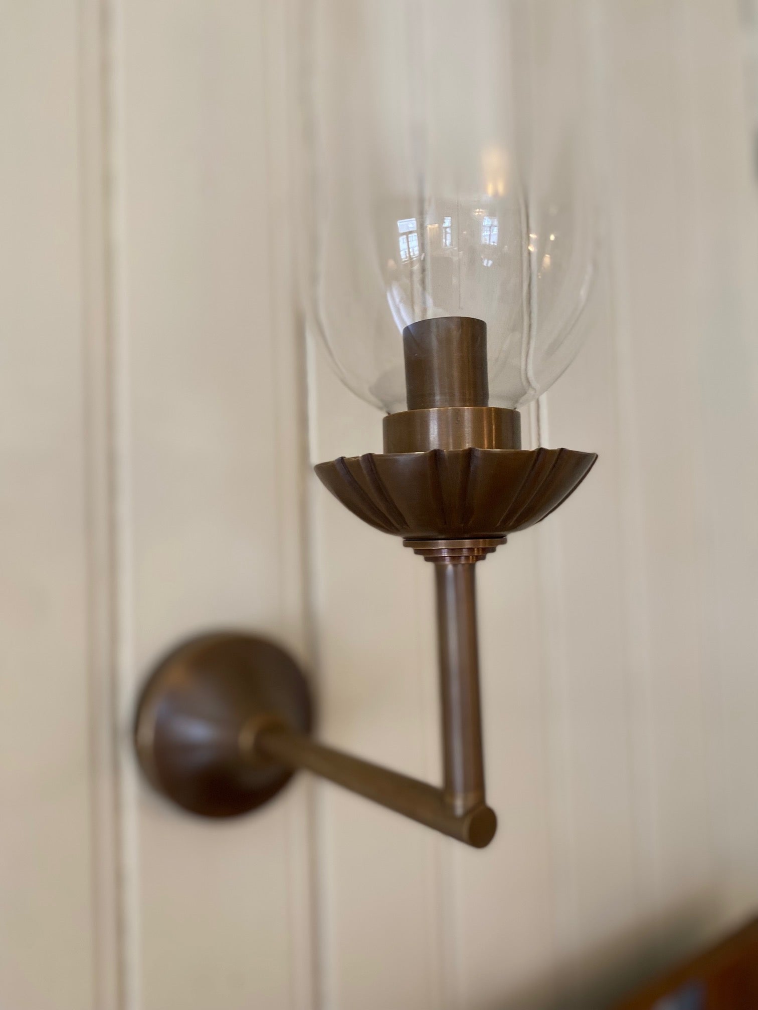 Elegant vegglampe i messing med glasskjerm. Lampen kombinerer tidløs design med funksjonell design. Glasskjermen sprer lyset jevnt og skaper en koselig atmosfære.