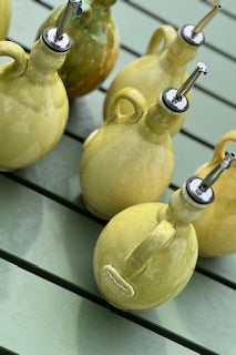 These beautiful olive oil bottles are specially made for Alabaster and hand-molded from clay with a production time of three days per bottle. Glazed in unique color combinations, they are not only practical, but also a jewel on the kitchen counter or dining table.