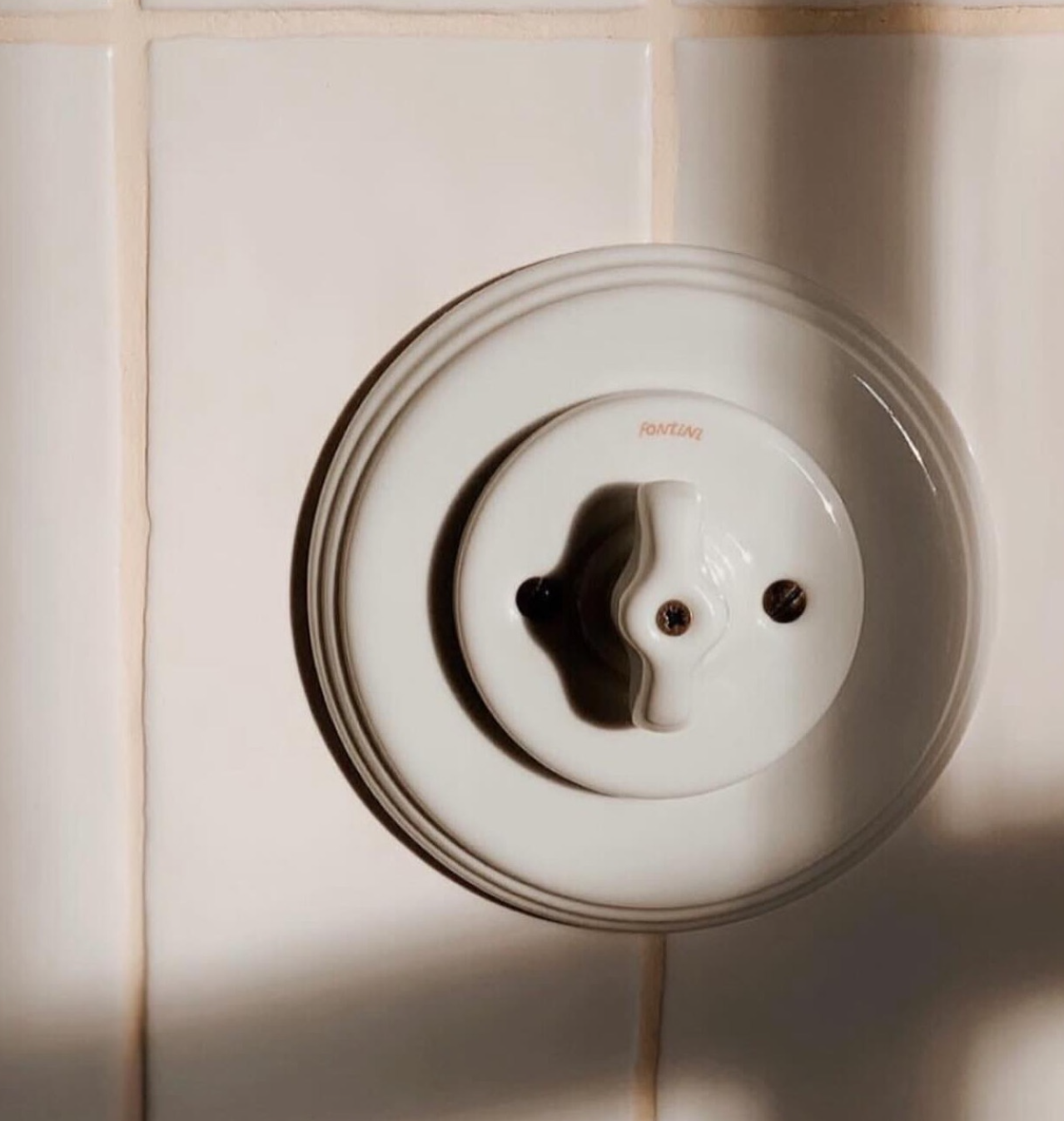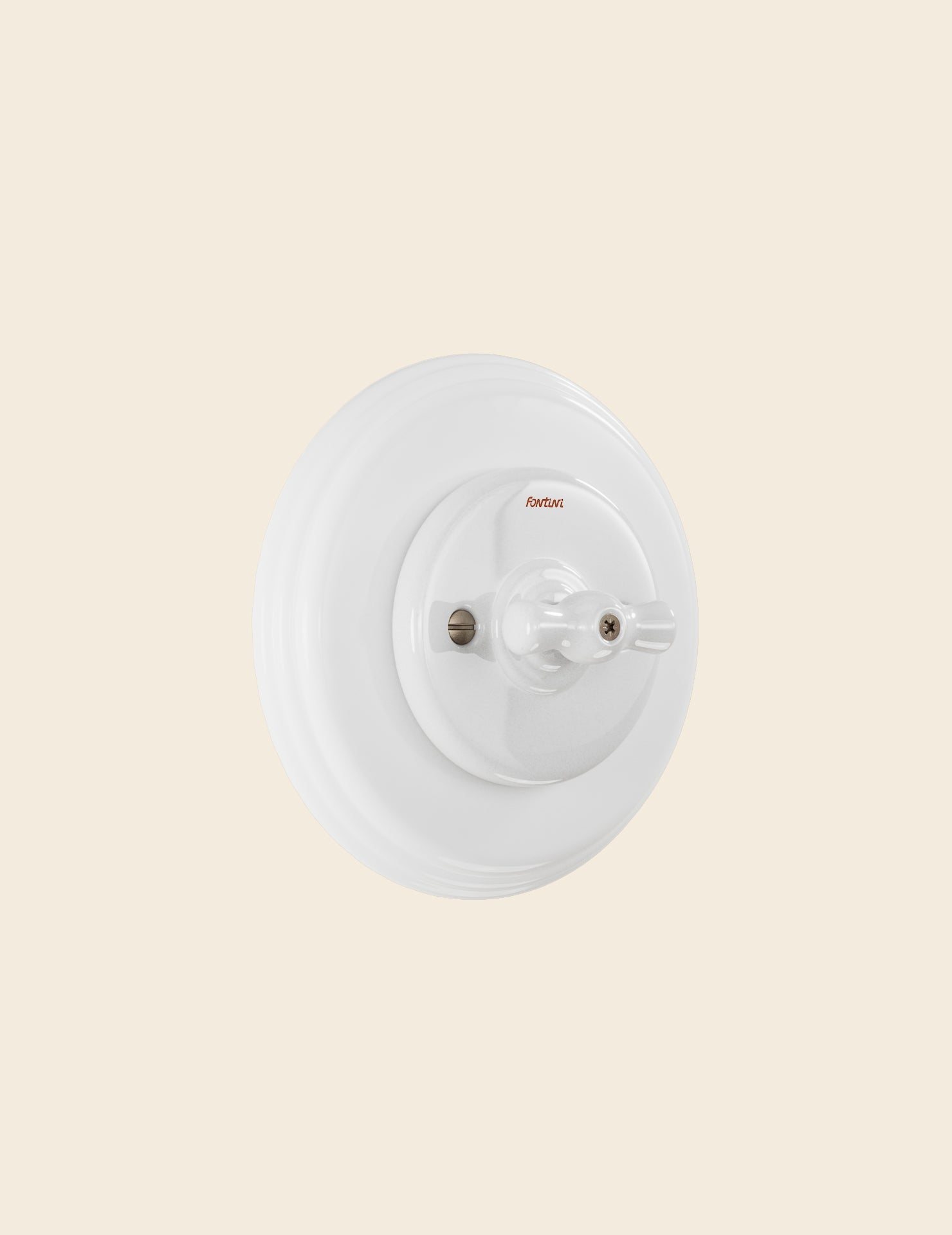 On the edge of the front is the discreet "Fontini" brand. The switch is CE marked and has the same design as our other white porcelain sockets and switches, so it fits in well with them.