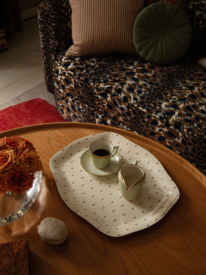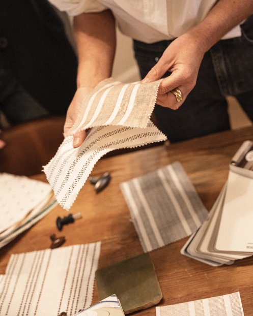 Tekstilene er utviklet med stor omtanke for materialer, farger og trykketeknikker. Gjennom en nøye balansert prosess bringes hver design til liv, enten gjennom delikate håndmalte mønstre eller presist utførte trykk som fremhever stoffenes taktile kvalitet og subtile nyanser.