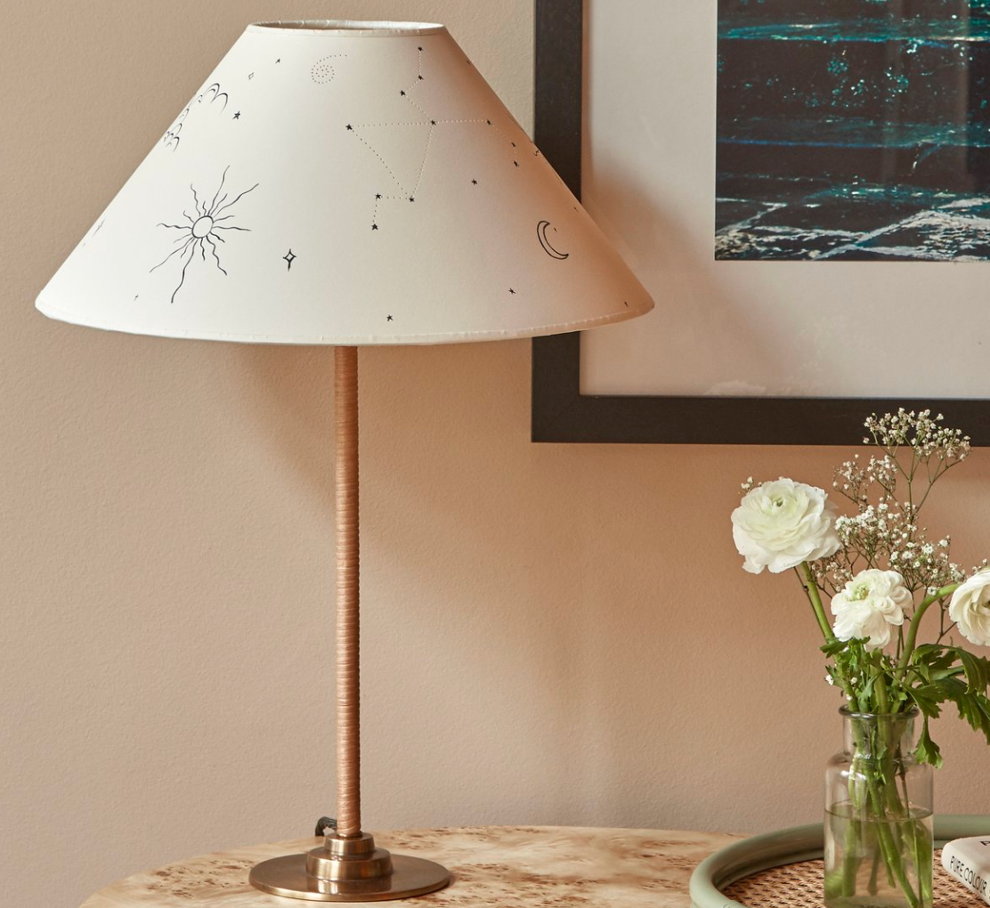 Lampeskjerm er utsmykket med delikate illustrasjoner inspirert av himmelen, og hyller kosmos og den eldgamle kunsten astrologi. Når skjermen lyser opp fra innsiden, vil håndstansede hull som viser stjernebildene gløde mykt – en nikk til den glitrende nattehimmelen.